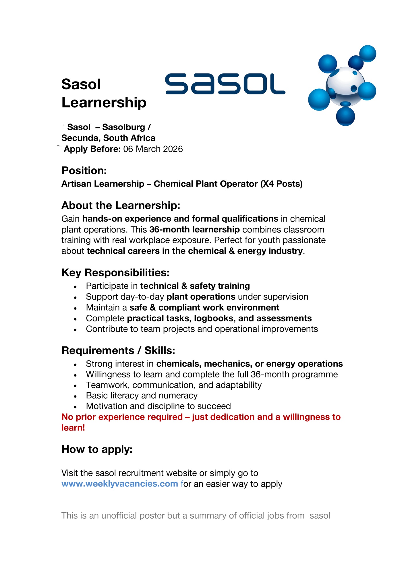 Are you an aspiring chemical plant operator looking for a career-launching opportunity in South Africa’s chemical and energy industry? Sasol, a global integrated chemicals and energy company with over 75 years of innovation, is offering four Learnership positions for the Natref operations. This programme combines structured classroom learning with hands-on workplace experience over 36 months, providing a pathway to technical and operational careers in the energy sector.